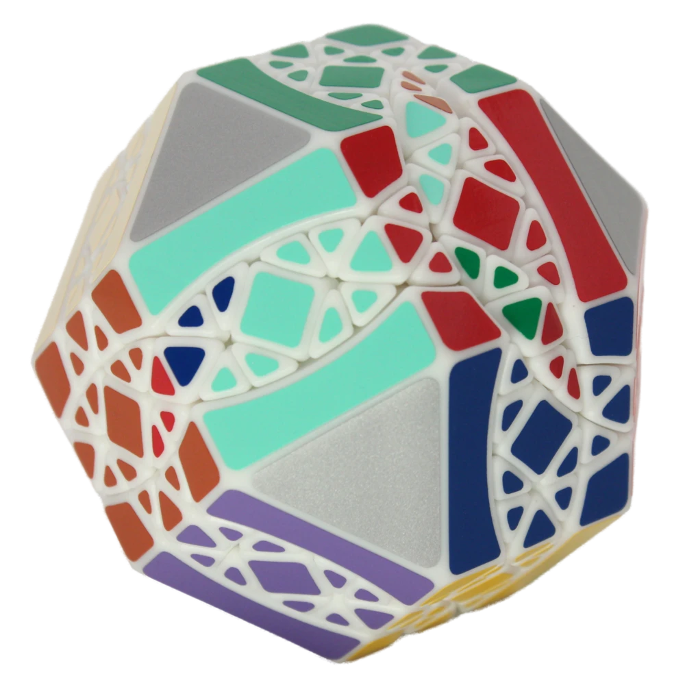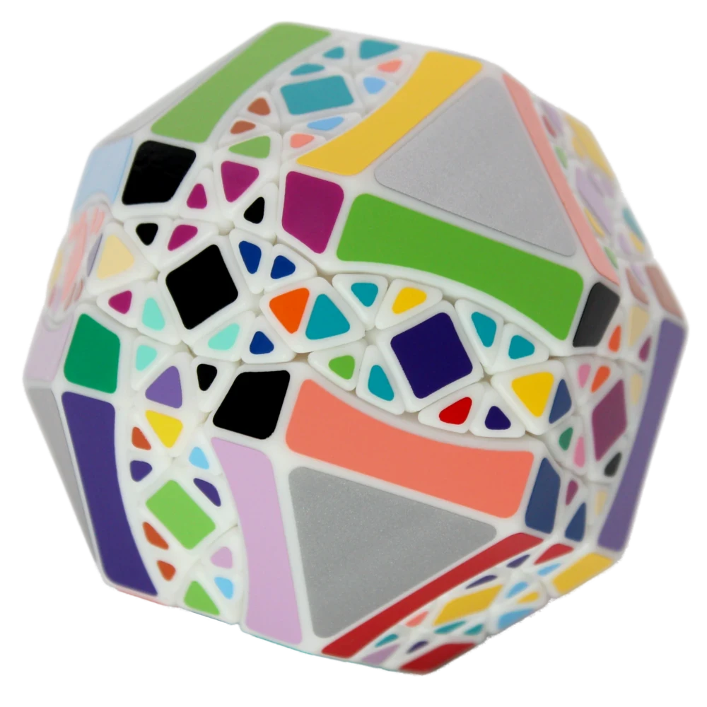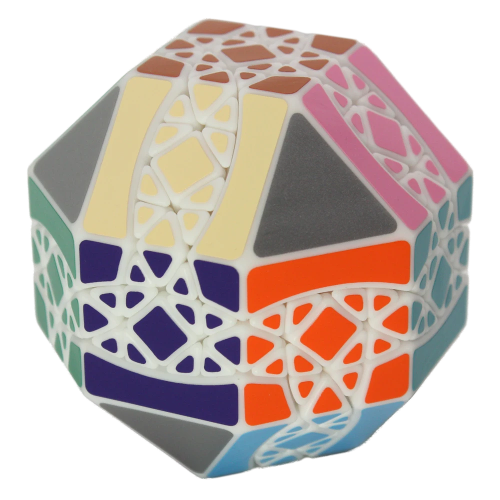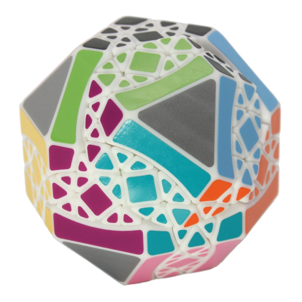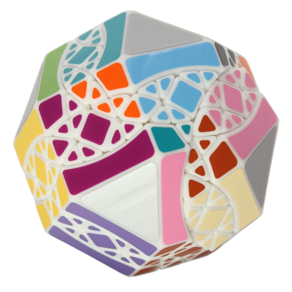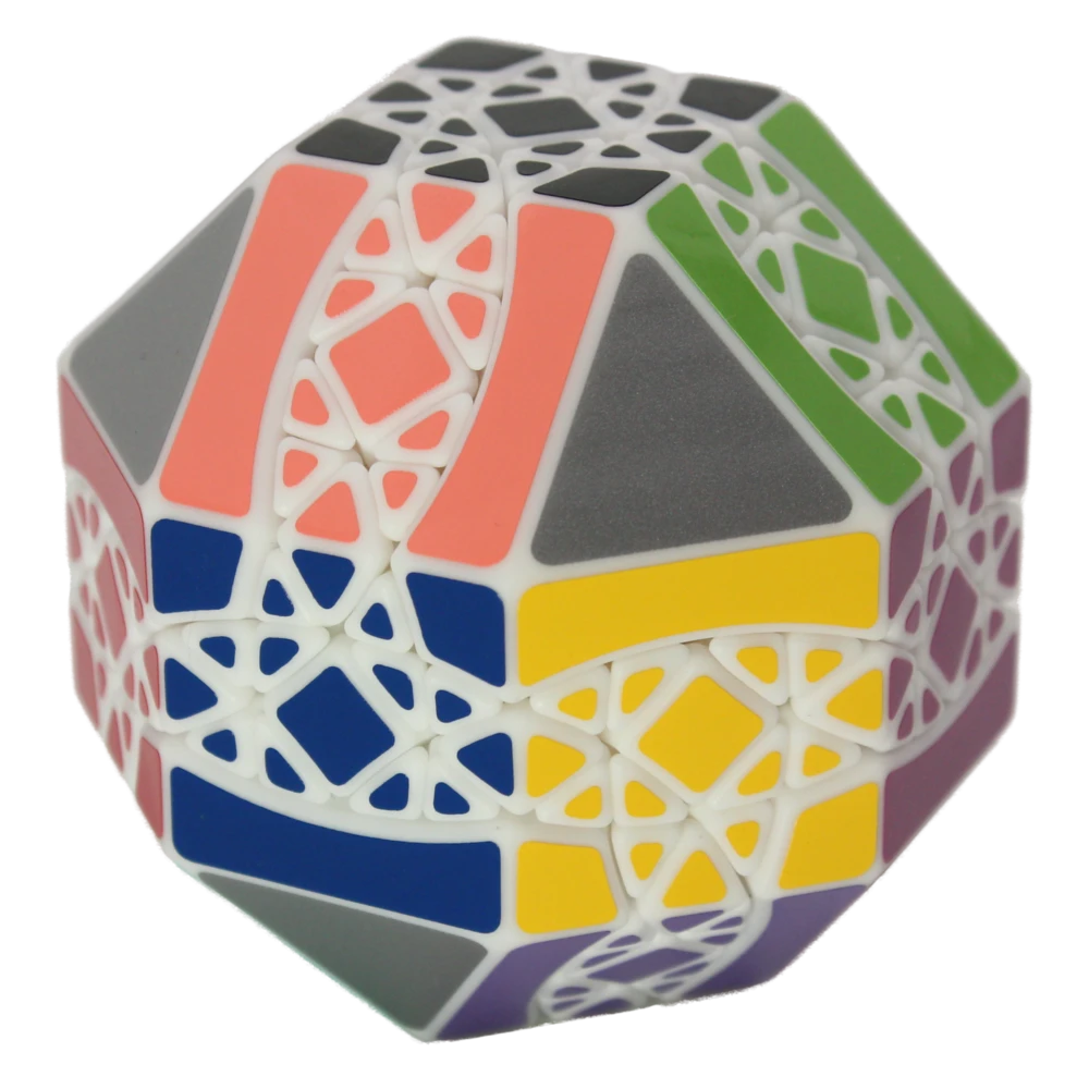 The Pseudorhombicuboctahedron puzzle showcases the geometry of the elongaged square gyrobicupola, a rhombicuboctahedron that’s been ‘gyroed’ by 45 degrees. There are eight shallow turning axes on the triangular faces. If these cuts were implemented on an ordinary rhombicuboctahedron, the resulting puzzle would be fairly simple like a Compy Cube. But due to the skew of the top and bottom axes, a complex cut pattern emerges, with 218 visible pieces.