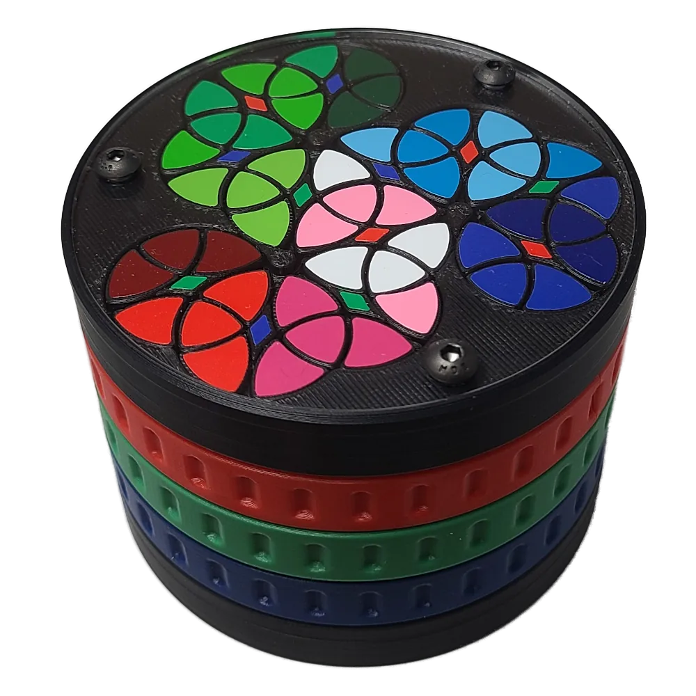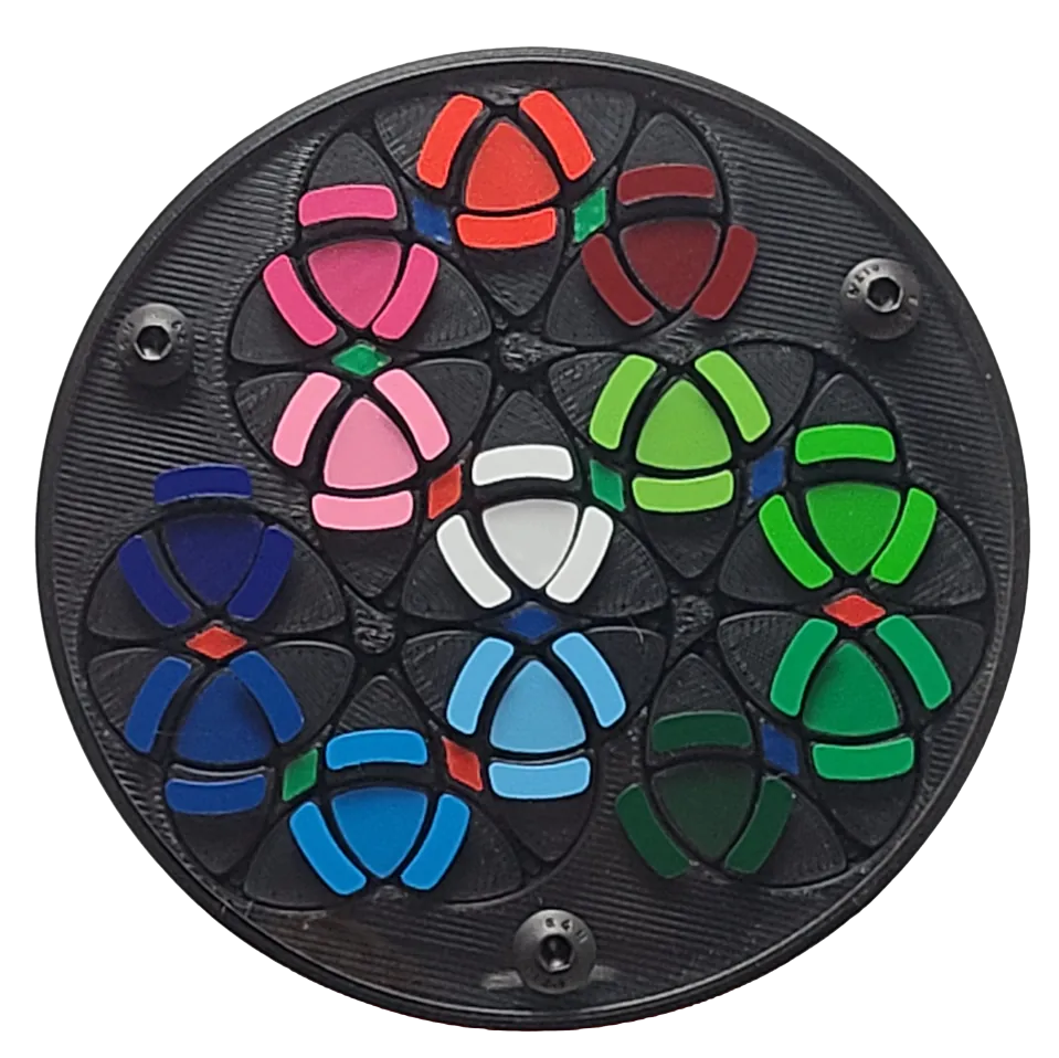 The top and bottom are covered by clear plexiglass plates. This makes an alternate simplified sticker scheme possible: the “petal” stickers are stuck to the fixed plexiglass so only the triangle pieces beneath need to be solved.