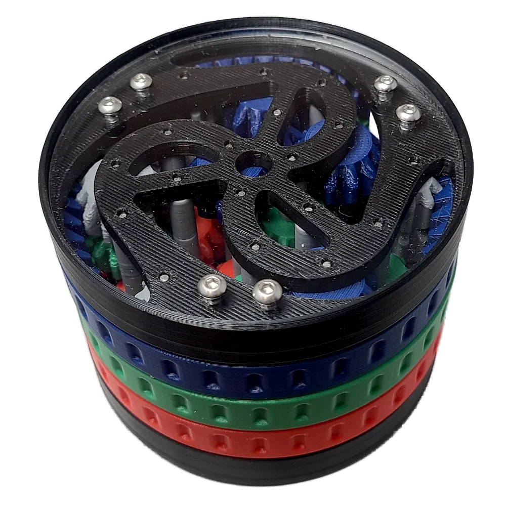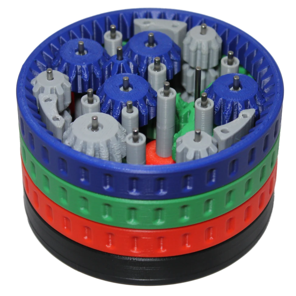 I geared the circles together with an external ring gear. Spinning a colored ring causes the corresponding circles to rotate. The mechanism is assembled using a 3D printed kit of axles, bevel gears, and metal pins assembled in layers.